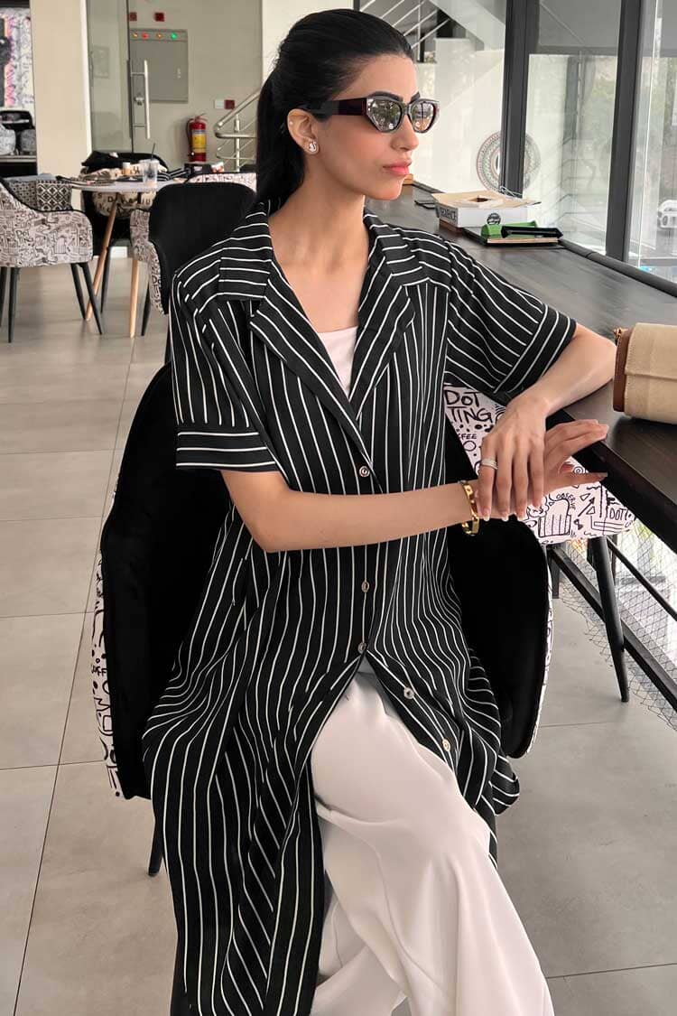 This elegant dress combines a structured design with a touch of feminine charm, making it an ideal choice for both casual outings and semi-formal occasions.